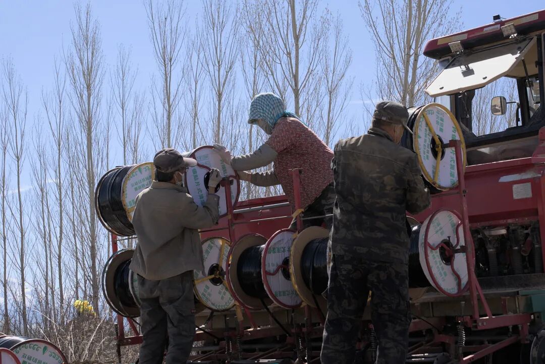 农户正在安装滴灌带铺设设备。王正佳 摄