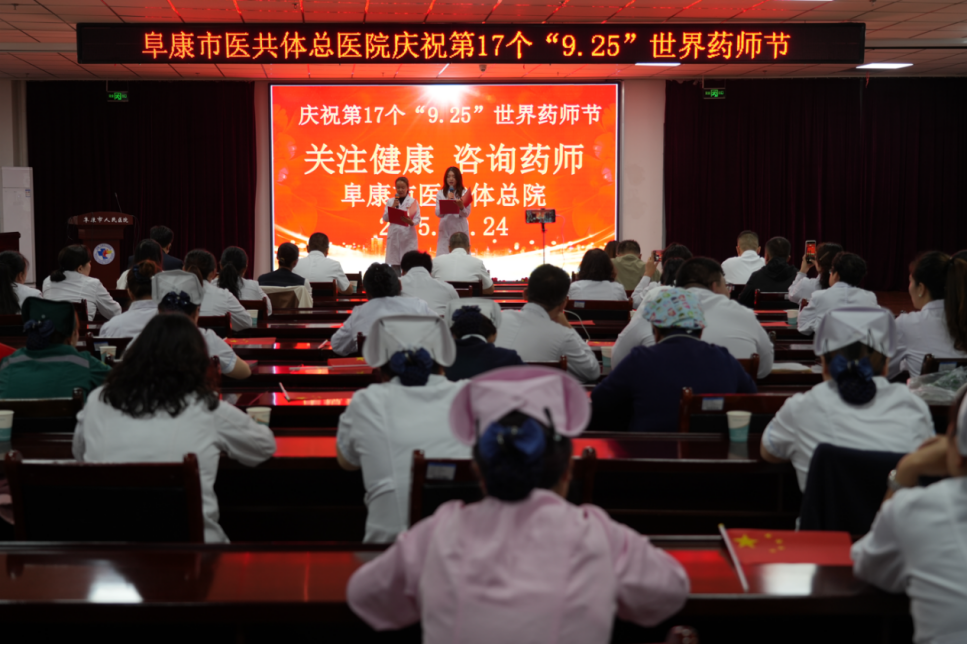 2025年9月25日是第17个世界药师节。9月24日下午,阜康市医共体总医院以“关注健康、咨询药师”为主题,在市人民医院院区学术厅隆重举行第17个世界药师节表彰大会。阜康市卫生健康系统80余名代表参加了此次表彰大会。