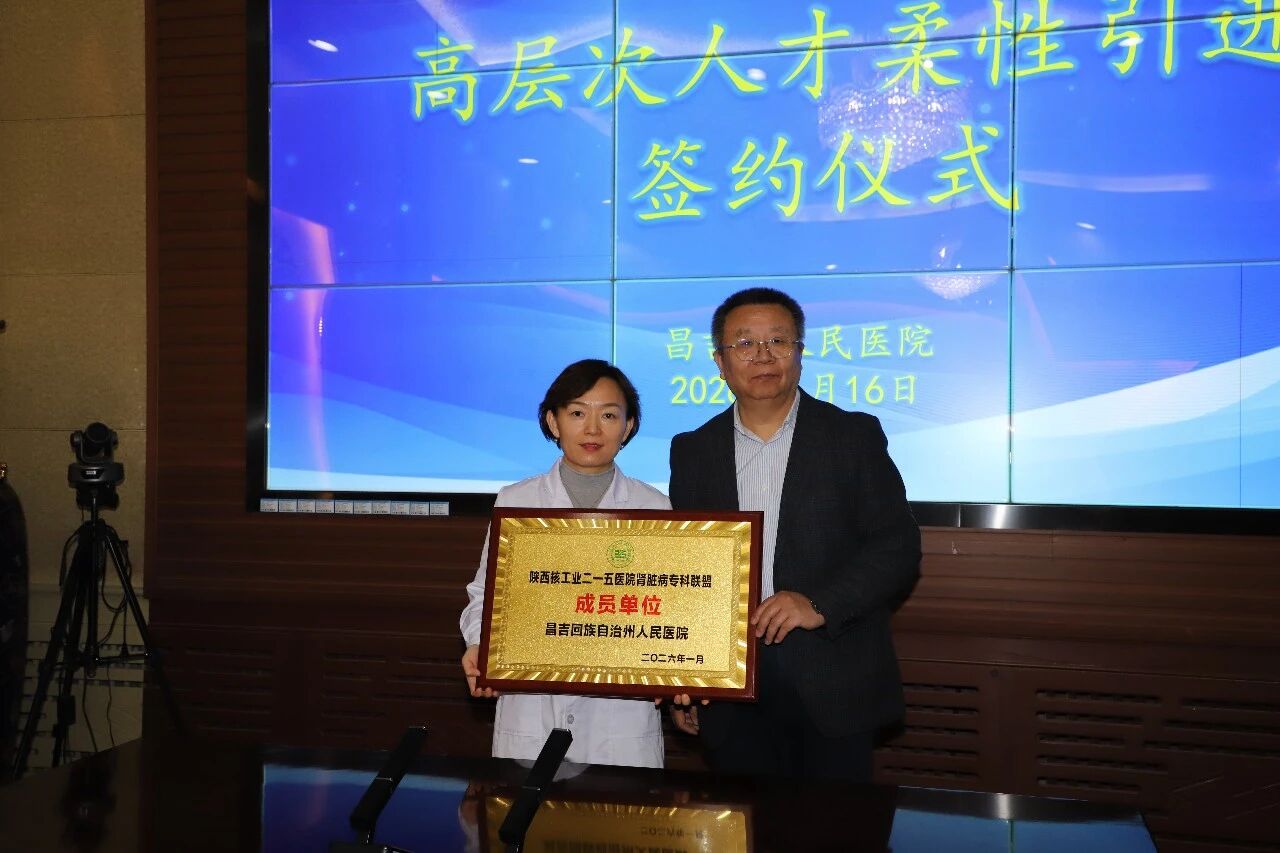 近日,昌吉回族自治州人民医院举行柔性人才引进签约暨工作室揭牌仪式,引进陕西核工业二一五医院肾内科主任刘国担任昌吉回族自治州人民医院肾病科名誉主任。昌吉州人民医院领导班子成员及相关行政职能科室主任、肾病科医护人员参加仪式。