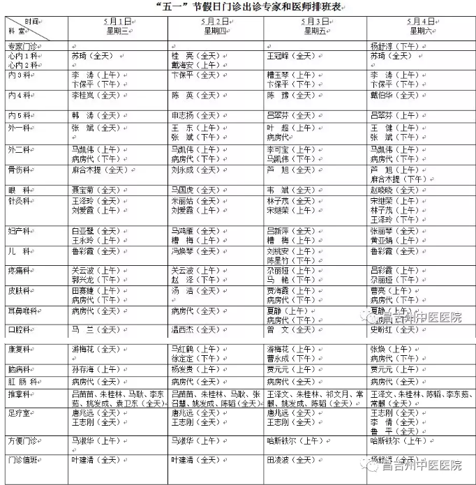 昌吉州中医医院“五一”节假日门诊出诊专家和医师排班表