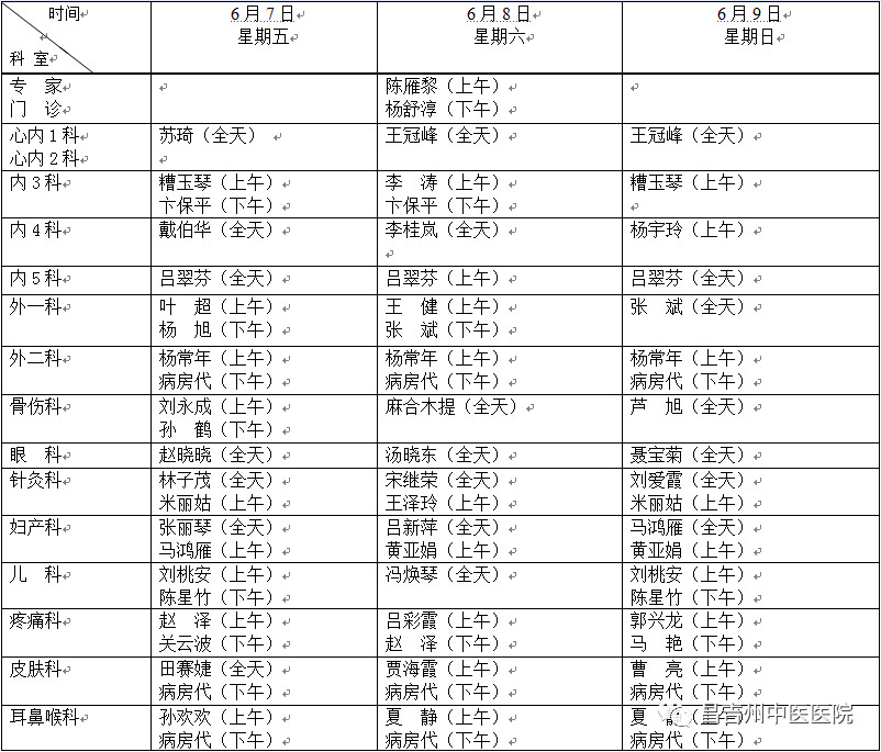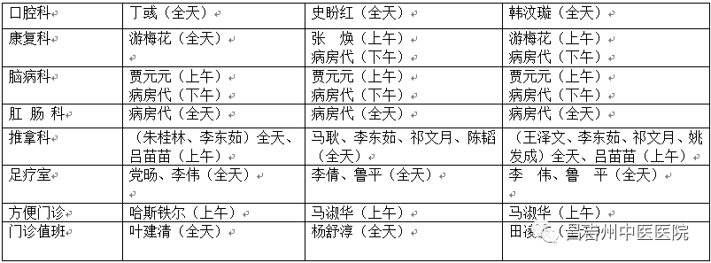 昌吉州中医医院端午节期间门诊出诊医师排班表