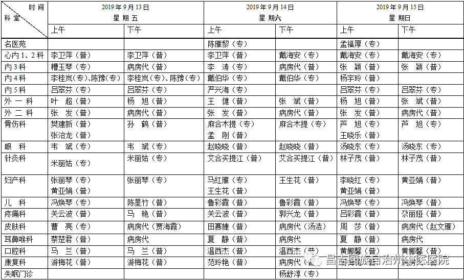 昌吉州中医医院中秋节期间门诊出诊医师排班表