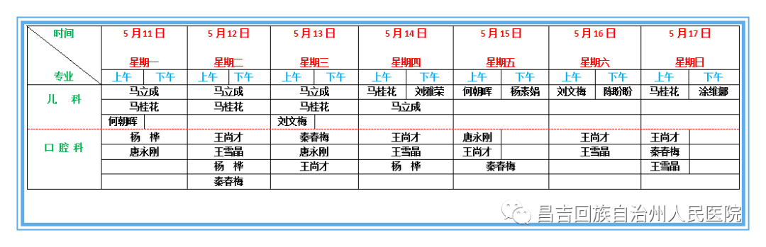 昌吉州人民医院北院儿童医院 儿科及口腔科门诊医生坐诊表(5月11日—17日)
