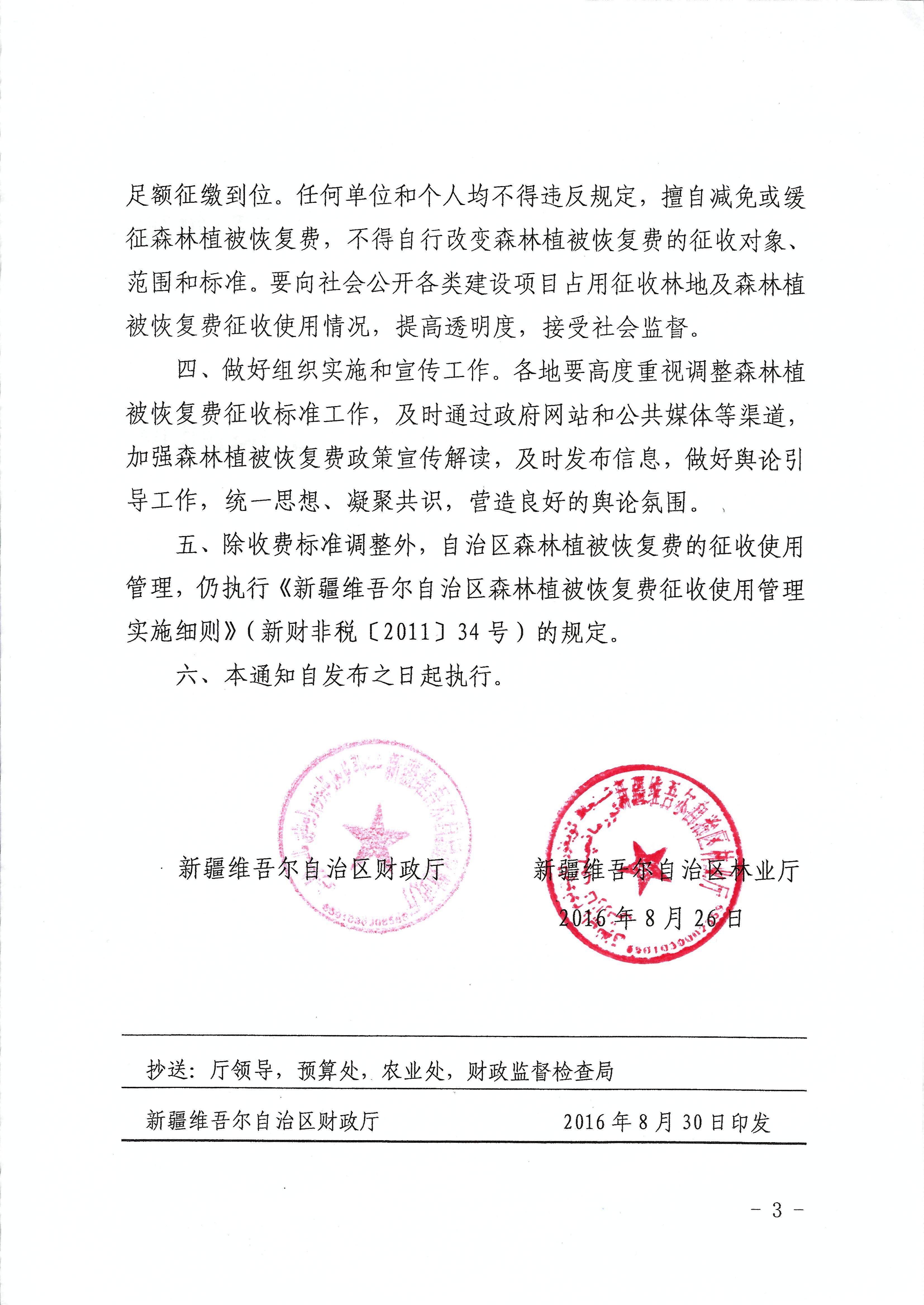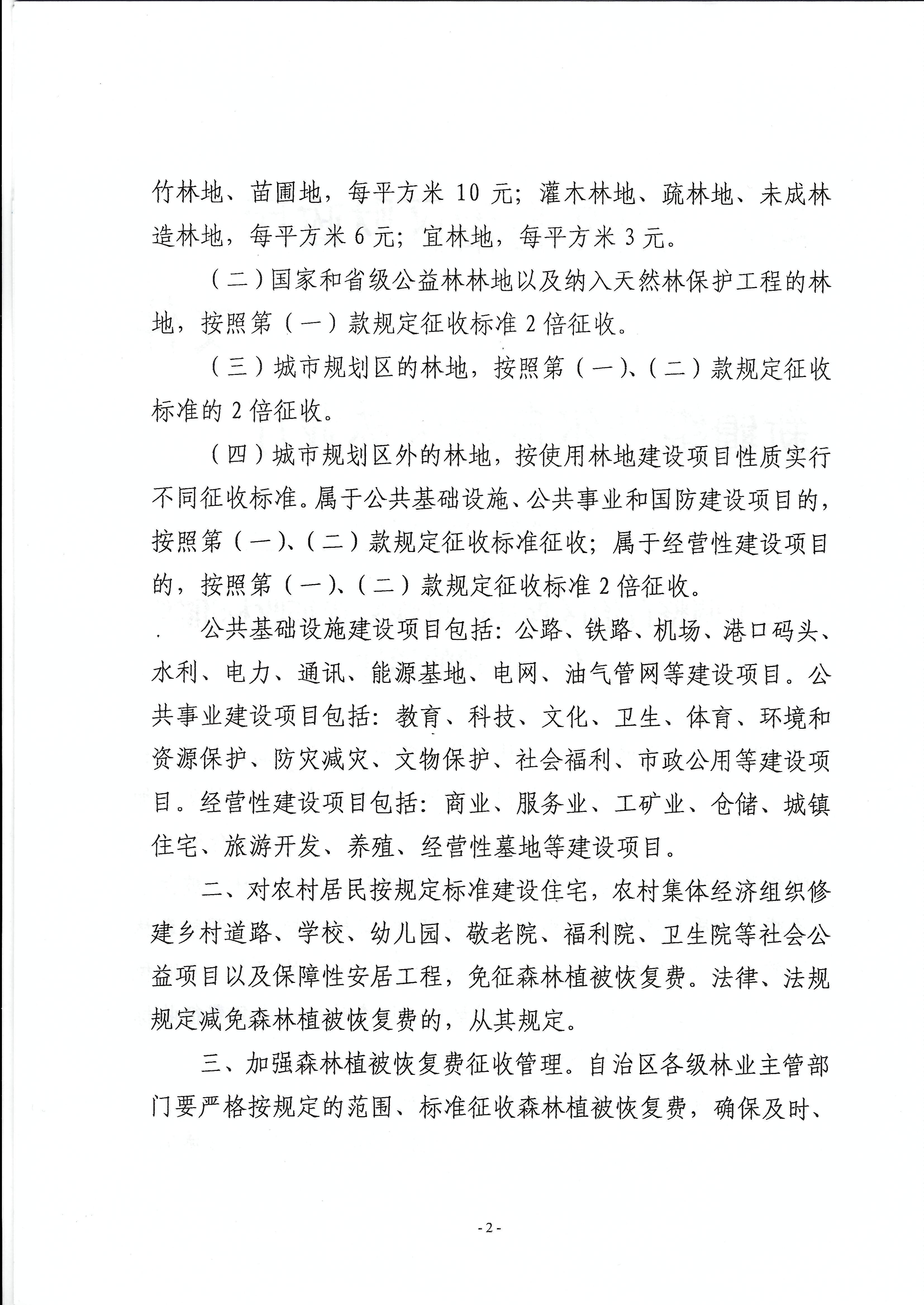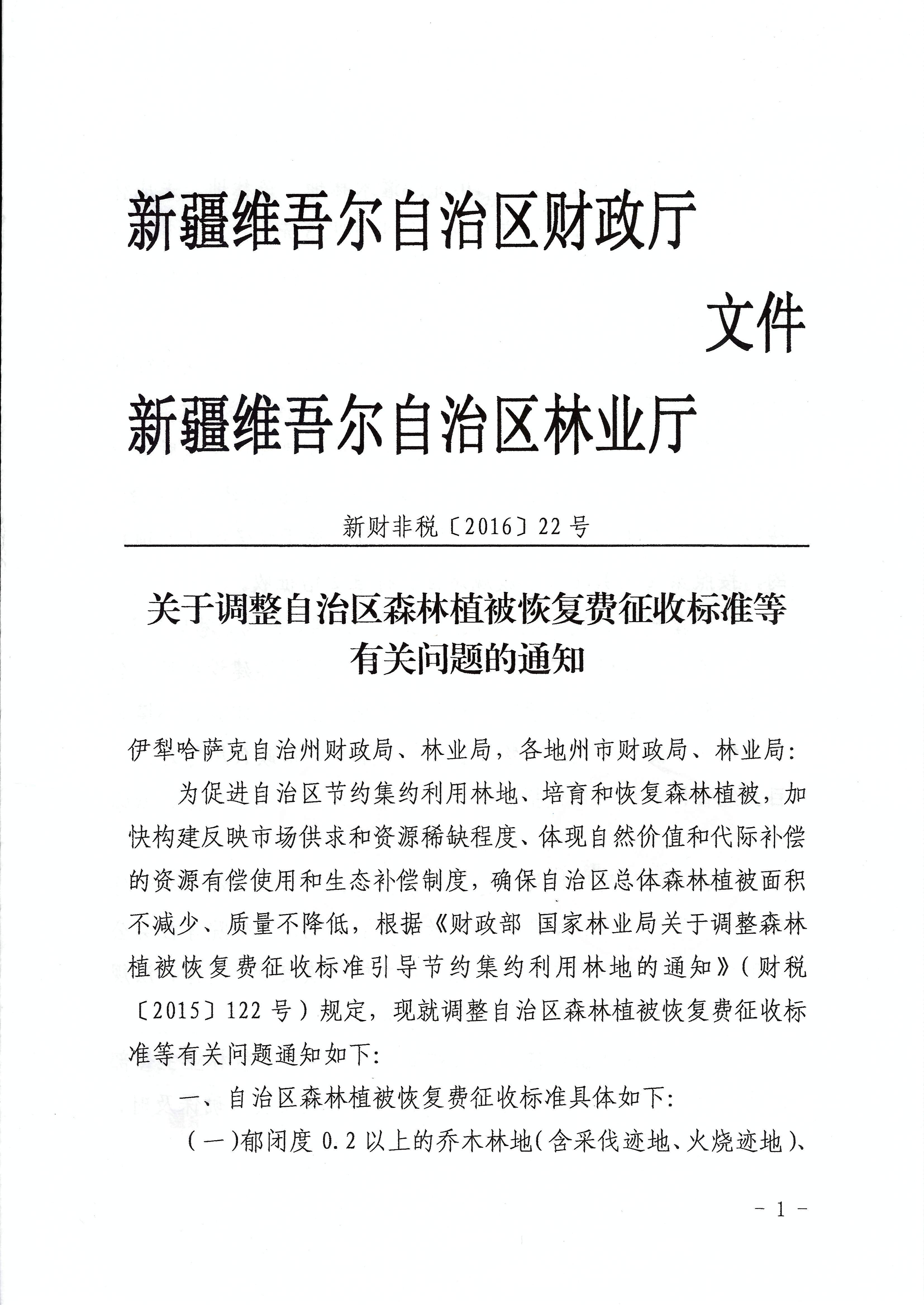 关于调整自治区森林植被恢复费征收标准等有关问题的通知