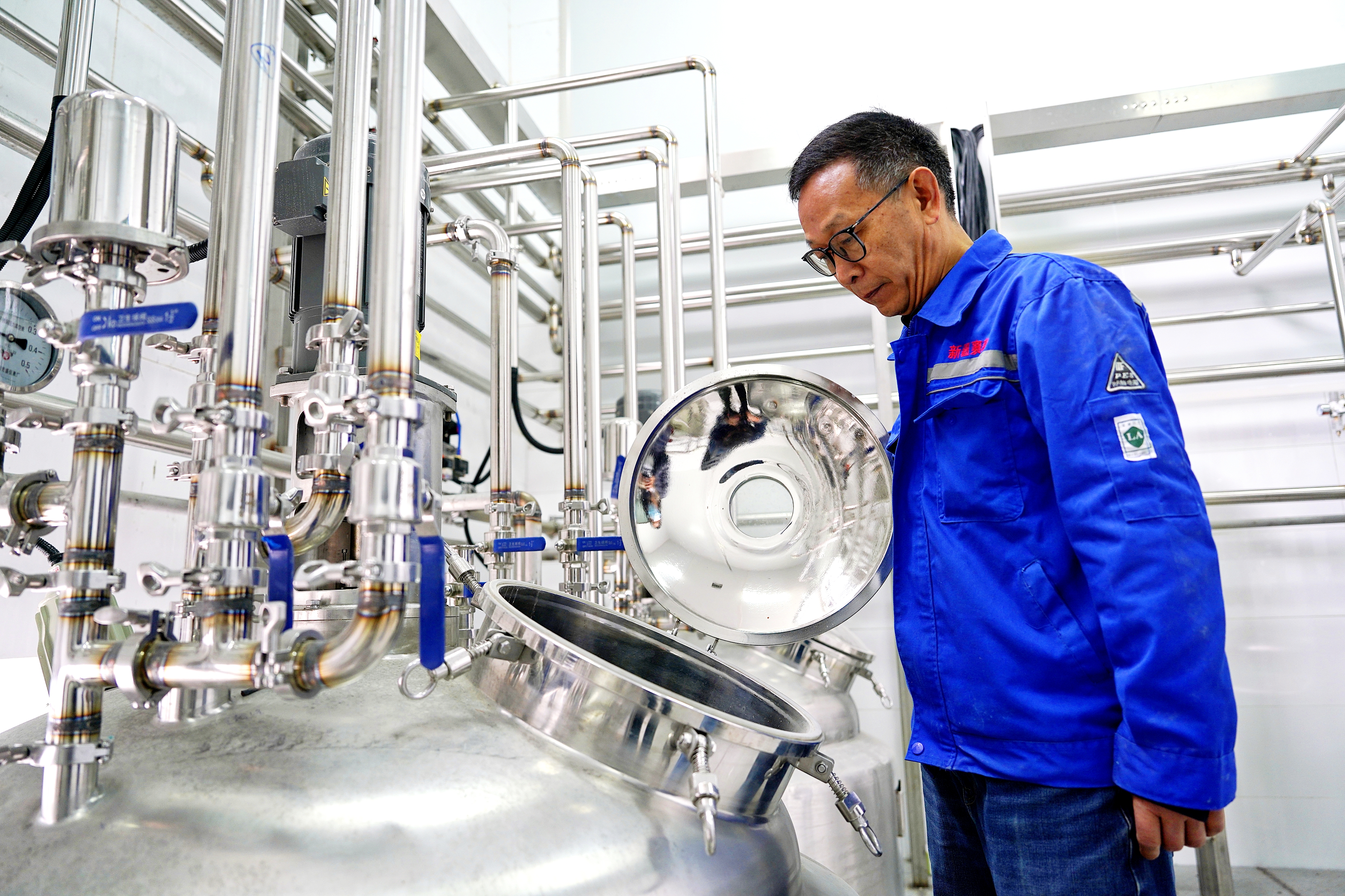 4月15日,新疆襄新畜产品有限公司肝素钠肠衣车间,工作人员正在察看肝素钠提取装置。记者常谊谊 摄