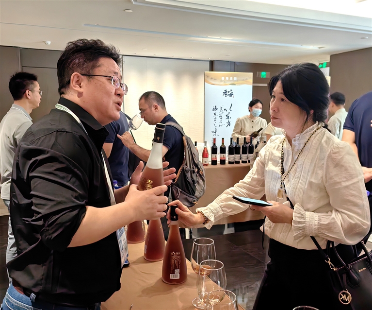 11月9日,新疆·昌吉天山北麓葡萄酒产区(广州)招商推介会上,天山北麓葡萄酒产区酒企、酒庄代表向经销商介绍葡萄酒。本报记者 王 薇摄
