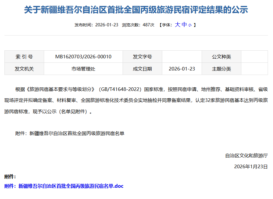 近日,新疆维吾尔自治区文化和旅游厅发布《2025年新疆维吾尔自治区四星级旅游饭店评定结果公示》和《关于新疆维吾尔自治区首批全国丙级旅游民宿评定结果的公示》,昌吉州4家酒店获评自治区四星级旅游饭店,3家民宿获评自治区首批全国丙级旅游民宿。具体信息如下: