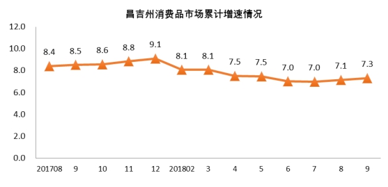 1-9月,全州实现社会消费品零售总额219.35亿元,同比增长7.3%,增速较上年同期回落1.2个百分点,较今年1-8月提高0.2个百分点。