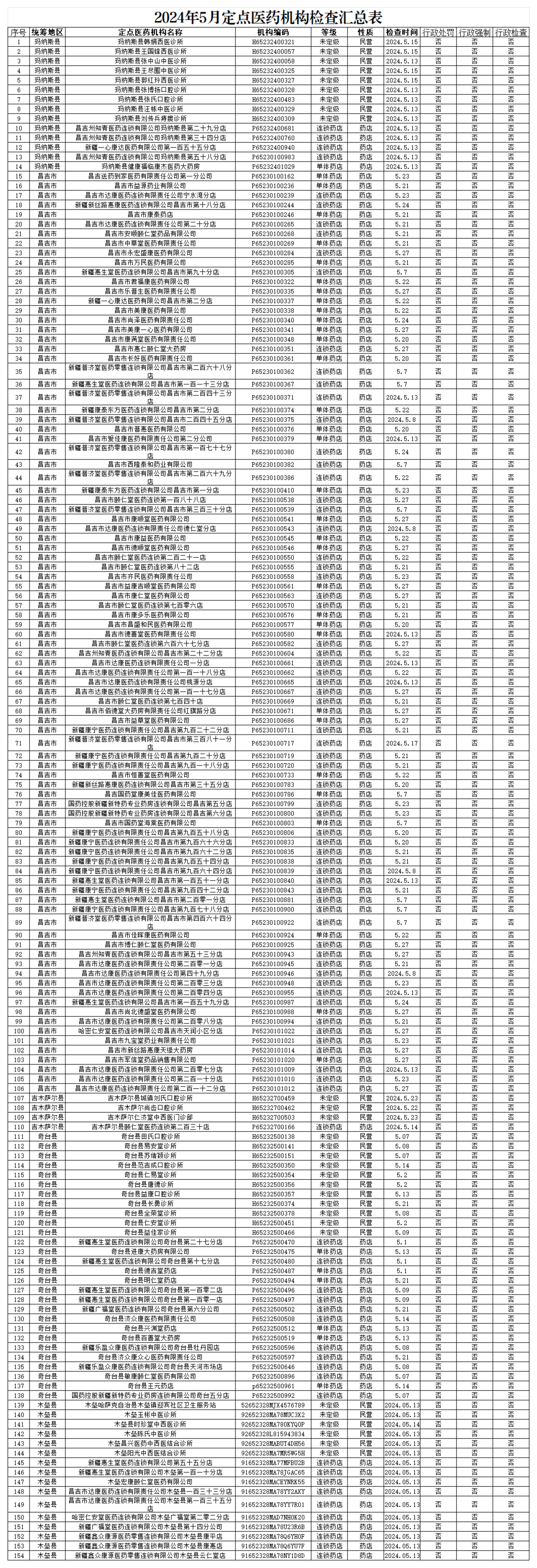 2024年5月定点医药机构检查汇总表