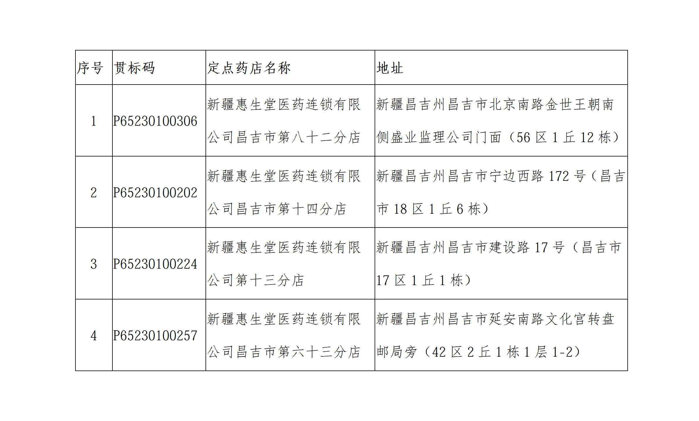 为进一步加强定点零售药店管理,维护医保基金安全,根据《零售药店医疗保障定点管理暂行办法》《医疗保障基金使用监督管理条例》等有关规定及医保服务约定内容,通过现场检查发现,个别定点零售药店存在违反《昌吉州定点零售药店医疗保障服务协议》的情况。经研究决定,对以下4家定点零售药店进行中止医保服务处理,现将名单公布如下: