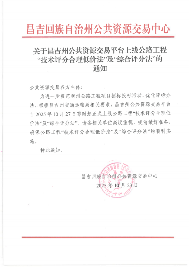 关于昌吉州公共资源交易平台上线公路工程“技术评分合理低价法”及“综合评分法”的通知