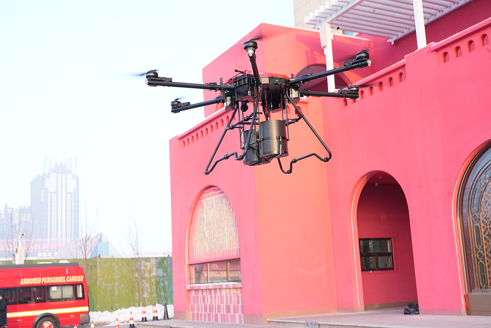 演练模拟锦江都城酒店13层及地下车库新能源车辆突发火灾,现场浓烟弥漫,火势快速向上蔓延,楼内多名人员被困,情况危急。火情发生后,酒店工作人员第一时间启动应急预案,有序引导楼内人员疏散撤离,并开展初期火灾扑救,为后续专业救援争取时间。昌吉州消防救援支队119指挥中心接警后,立即启动高层建筑火灾应急处置预案,快速调派世纪大道特勤站、石河子路消防救援站等多支力量赶赴现场处置。全勤指挥部在酒店西侧迅速设立火场指挥部,通信保障分队同步架设通信及图传设备,无人机随即升空开展火情侦察,并借助大疆FC30运载无人机精准投送救援装备,灭火无人机实施精准投弹,为指挥部实时掌握火情、科学决策部署和灭火救援行动提供了有力支撑。