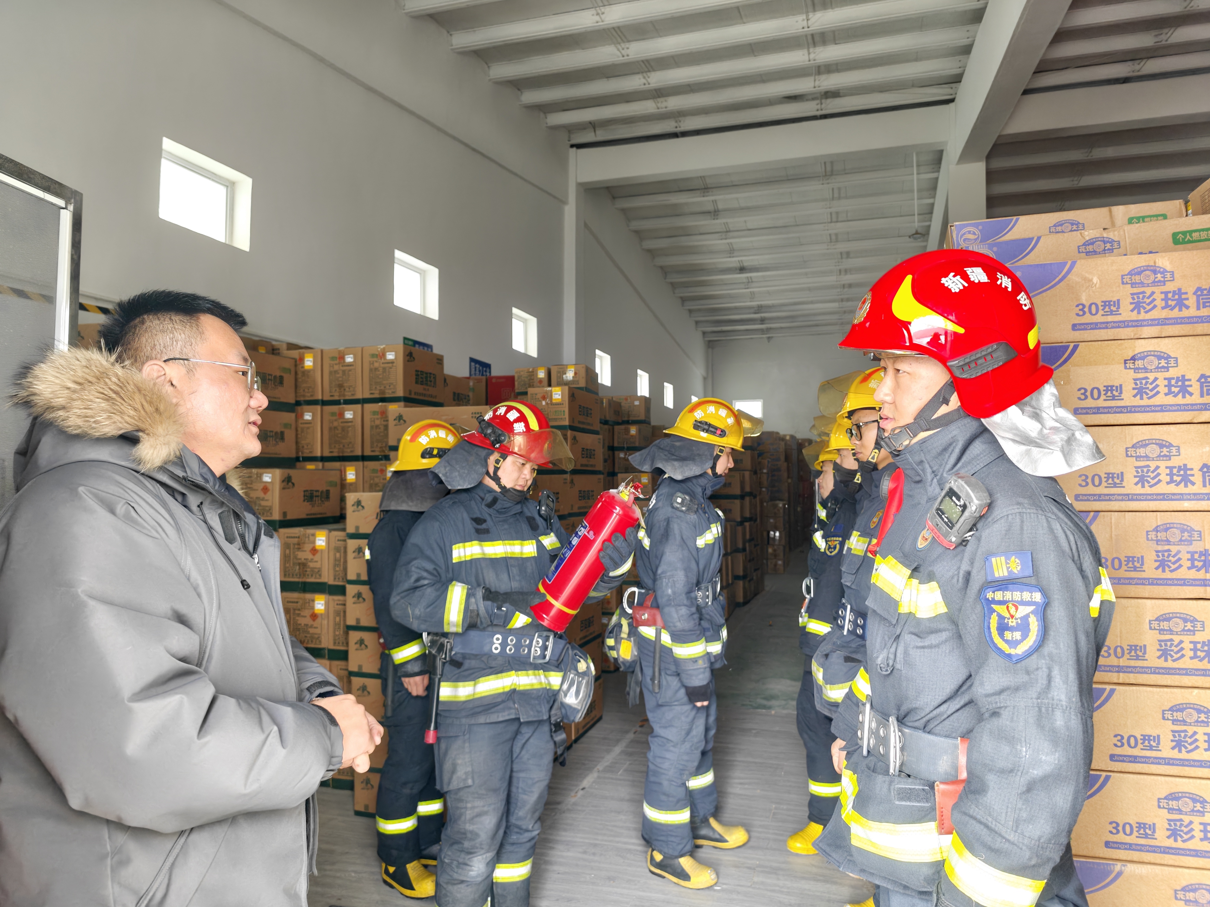 在昌吉市鑫陇烟花爆竹储存仓库,昌吉市屯河路消防站同步开展防消联勤巡查与消防安全培训,对烟花爆竹仓库消防设施设施、消防车道、消防水源等关键环节进行实地熟悉与排查,全面掌握场所消防安全状况。期间,组织仓库全体工作人员重点围绕烟花爆竹火灾特点、初期火灾扑救、应急疏散逃生等内容进行详细讲解培训,切实提升从业人员火灾防范意识和应急处置能力。期间,吉木萨尔县、玛纳斯县等县市同步加大烟花爆竹销售场所排查整治力度,同步开展现场消防安全培训,讲解烟花爆竹火灾特点、初期火灾扑救、应急疏散逃生等知识,全面提升从业人员消防安全素质和自防自救能力。